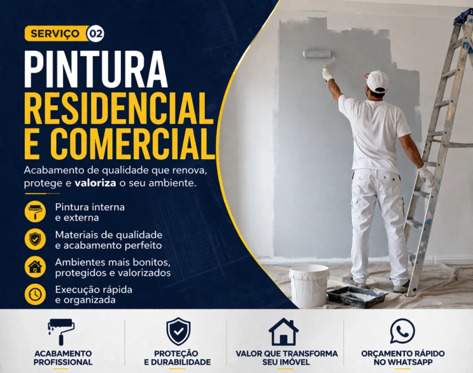 Também realizamos serviços complementares que fazem diferença no acabamento final do seu imóvel, como pintura interna e externa, limpeza pós-obra e limpeza de telhado. Tudo é feito com foco em entregar um ambiente limpo, funcional e pronto para uso, seja em residência ou estabelecimento comercial em Taubaté e região.