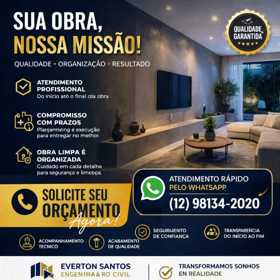 Na Everton Santos Engenharia & Reformas, cada serviço é pensado para entregar qualidade real, sem improvisos. Nosso diferencial está no acompanhamento técnico, na organização da execução e no compromisso com um resultado que valoriza seu imóvel. Se você está buscando engenheiro civil em Taubaté, empresa de reformas em Taubaté/SP ou uma equipe confiável para sua obra, fale conosco.